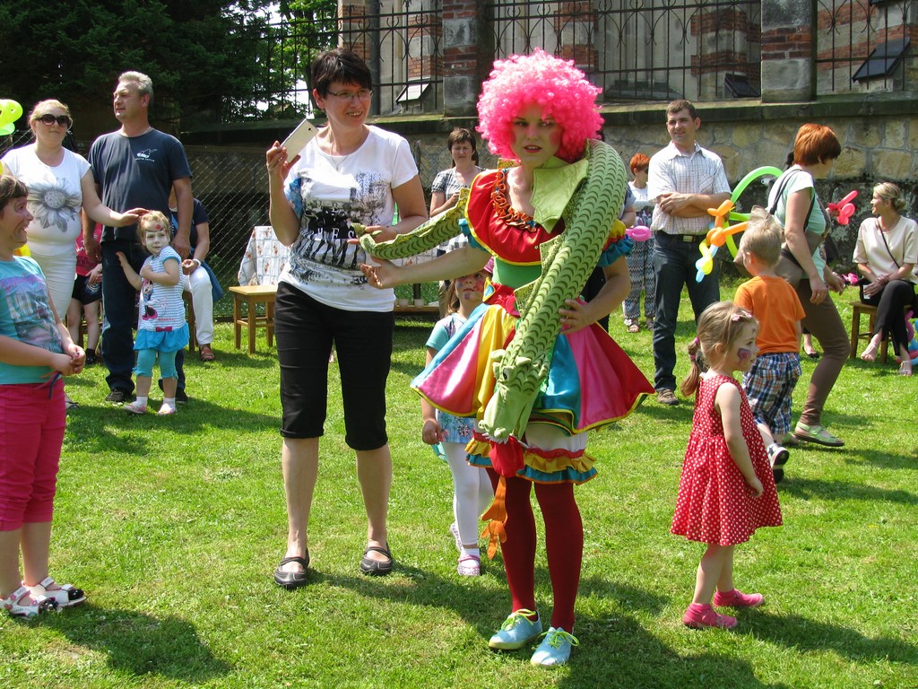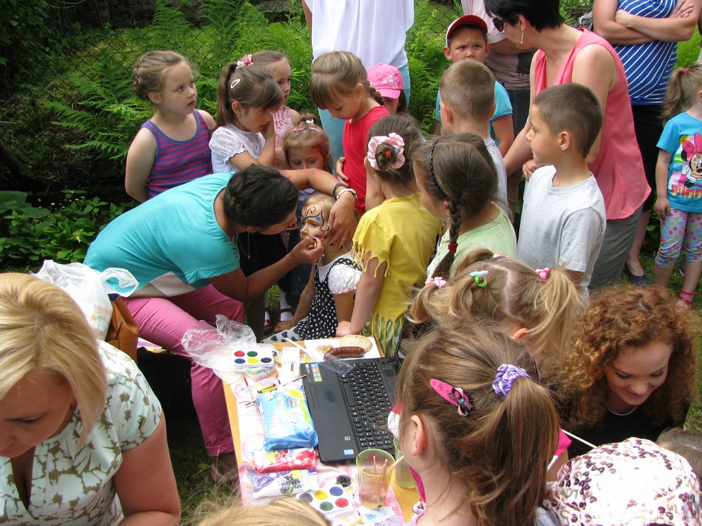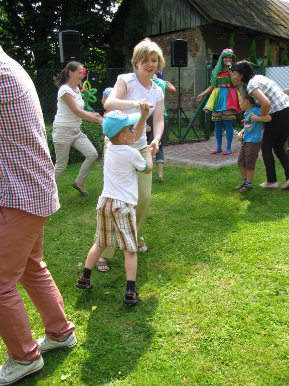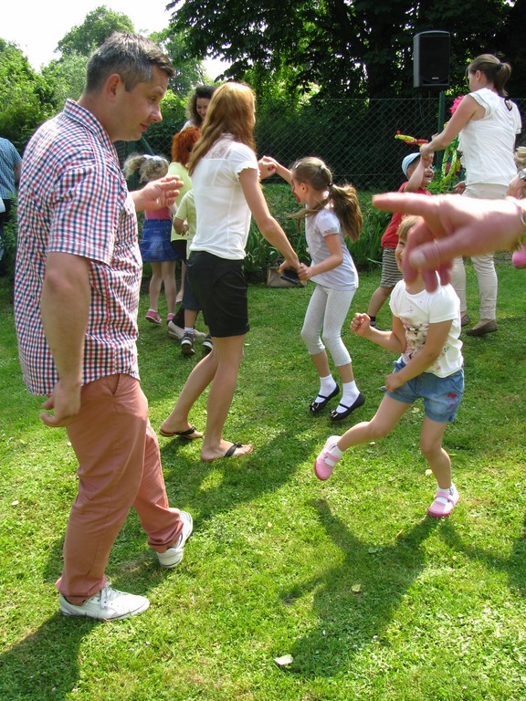 Dwie barwnie ubrane Panie animatorki z zespołu Animaniak dwoiły się i troiły aby rozbawić i wprawić w dobry nastrój nie tylko dzieci, ale także rodziców. Pokaz tęczowych mydlanych baniek ogromnych rozmiarów fruwających po całym ogrodzie był niezwykle atrakcyjny dla wszystkich. Konkursy taneczne oraz zręcznościowe połączyły we wspólnej zabawie dzieci i dorosłych. Animacje balonowymi zwierzątkami, którymi zostały obdarowane wszystkie dzieci cieszyły się ogromnym zainteresowaniem. Był nawet konkurs dla tatusiów, którzy popisali się ogromnym hartem ducha i mięśni wykonując ponad 180 przysiadów. Zwycięzcami konkursu zostali Panowie: Gebert, Maślanka i Przewoźnik. Zielony i przytulny ogród przedszkola zamienił się w ogromną salę balową, na której dzieci z rodzicami świetnie się bawili. „Tutaj zawsze się dobrze czułam” – powiedziała jedna z mam wspominając swoje „przedszkolne czasy”. „Ten ogród kojarzy mi się z miłymi wspomnieniami z dzieciństwa” – wysapał jeden z tatusiów po konkursie na przysiady.
